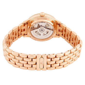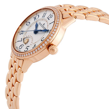 18kt rose gold case with a rose gold-tone 18kt rose gold bracelet. Fixed 18kt rose gold bezel with diamond set. Silver dial with blue sword-shaped hands and black Arabic numeral hour markers. Minute markers around an inner ring. Dial Type: Analog. Am/pm indicator subdials. Jaeger LeCoultre Calibre JLC 967A Automatic movement, containing 28 Jewels, composed of 214 parts, bitting at 28800 vph, and has a power reserve of approximately 42 hours. Scratch resistant sapphire crystal. Pull / push crown. Skeleton case back. Round case shape, case size: 29 mm, case thickness: 8.8 mm. Deployment clasp. Water resistant at 50 meters / 165 feet. Functions: hour, minute, second, day/night indicator. Rendez-vous Night And Day Series. Luxury watch style. Watch label: Swiss Made. Item Variations: Q3462121, 3462121, 346.21.21, Q346.21.21. Jaeger LeCoultre Rendez-Vous Silver Dial 18kt Rose Gold Automatic Ladies Watch Q3462121.