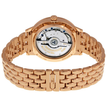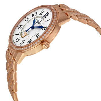 18kt rose gold case with a rose gold-tone 18kt rose gold bracelet. Fixed 18kt rose gold bezel with 60 diamond set. Silver dial with blue sword-shaped hands and black Arabic numeral hour markers. Minute markers around an inner ring. Dial Type: Analog. One subdial displaying: day/night indicator at the 6 o'clock position. Jaeger LeCoultre Calibre JLC 898A Automatic movement, based upon Jaeger LeCoultre 899, containing 30 Jewels, bitting at 28800 vph, and has a power reserve of approximately 43 hours. Scratch resistant sapphire crystal. Pull / push crown. Skeleton case back. Round case shape, case size: 34 mm, case thickness: 8.8 mm. Band width: 22 mm. Deployment clasp. Water resistant at 50 meters / 165 feet. Functions: hour, minute, second, day/night indicator. Rendez-vous Series. Dress watch style. Watch label: Swiss Made. Item Variations: Q3442120, 3442120, 344.21.20, Q344.21.20. Jaeger LeCoultre Rendez-Vous Silver Dial 18kt Rose Gold Ladies Watch Q3442120.