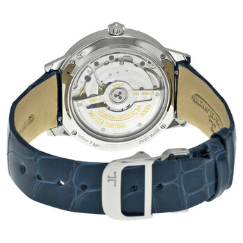 Silver-tone stainless steel case with a blue alligator leather strap. Fixed silver-tone stainless steel set with diamonds bezel. Silver dial with blue hands and Arabic numeral hour markers. Minute markers around an inner ring. Dial Type: Analog. Luminescent hands and markers. One subdial displaying: day-night indicator. Jaeger LeCoultre Calibre JLC 898A Automatic movement, based upon Jaeger LeCoultre 899, containing 30 Jewels, bitting at 28800 vph, and has a power reserve of approximately 43 hours. Scratch resistant sapphire crystal. Pull / push crown. Skeleton case back. Round case shape, case size: 34 mm, case thickness: 8.8 mm. Deployment clasp. Water resistant at 50 meters / 165 feet. Functions: hour, minute, second, day/night indicator. Rendez-vous Series. Luxury watch style. Watch label: Swiss Made. Item Variations: Q3448420, 3448420, 344.84.20, Q344.84.20. Jaeger LeCoultre Rendez-Vous Silver Dial Diamond Bezel Blue Leather Ladies Watch Q3448420.