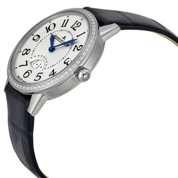 Silver-tone stainless steel case with a black leather strap. Fixed silver-tone bezel with diamond set. White dial with blue toned sword-shaped hands and black Arabic numeral hour markers. Minute scale around the inner rim. Dial Type: Analog. Date display at the 6 o'clock position. Jaeger LeCoultre Calibre JLC 688 quartz movement. Scratch resistant sapphire crystal. Solid case back. Round case shape, case size: 34 mm. Tang clasp. Water resistant at 30 meters / 100 feet. Functions: date, hour, minute. Rendez-vous Series. Luxury watch style. Watch label: Swiss Made. Item Variations: Q3478422, 3478422, 347.84.22, Q347.84.22. Jaeger LeCoultre Rendez-Vous White Dial Diamond Bezel Black Leather Ladies Watch Q3478422.
