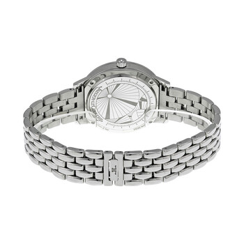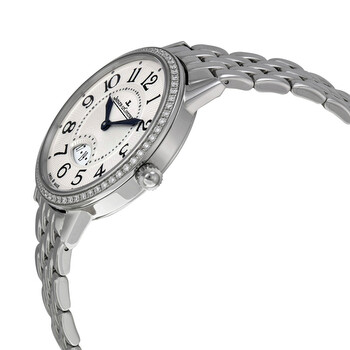 Silver-tone stainless steel case with a silver-tone stainless steel bracelet. Fixed silver-tone diamond set bezel. White dial with blue sword-shaped hands and black Arabic numeral hour markers. Minute markers around an inner ring. Dial Type: Analog. Date display at the 6 o'clock position. Jaeger LeCoultre Calibre JLC 688 quartz movement. Scratch resistant sapphire crystal. Pull / push crown. Solid case back. Round case shape, case size: 34 mm, case thickness: 12.4 mm. Band width: 20 mm. Deployment clasp. Water resistant at 30 meters / 100 feet. Functions: date, hour, minute, second. Rendez-vous Series. Luxury watch style. Watch label: Swiss Made. Item Variations: Q3478121, 3478121, 347.81.21, Q347.81.21. Jaeger LeCoultre Rendez-Vous White Dial Diamond Bezel Stainless Steel Ladies Watch Q3478121.