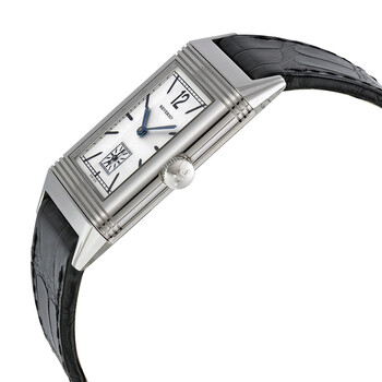 18kt white gold case with a black leather strap. Fixed 18kt white gold bezel. Silver dial with blue hands and index hour markers. Arabic numeral appears at the 12 o'clock position. minute markers around the outer rim. Dial Type: Analog. One subdial displaying: small second at the 6 o'clock position. Jaeger LeCoultre Calibre JLC 822 Hand Wind movement, containing 21 Jewels, composed of 134 parts, bitting at 21600 vph, and has a power reserve of approximately 45 hours. Scratch resistant sapphire crystal. Pull / push crown. Solid case back. Rectangle case shape, case size: 46 mm x 27 mm, case thickness: 7.2 mm. Band width: 22 mm, band length: 8 inches. Tang clasp. Water resistant at 30 meters / 100 feet. Functions: hour, minute. Reverso 1931 Series. Luxury watch style. Watch label: Swiss Made. Item Variations: Q2783520, 2783520, 278.35.20, Q278.35.20. Jaeger LeCoultre Reverso 1931 Silver Dial Black Leather Men's Watch Q2783520.