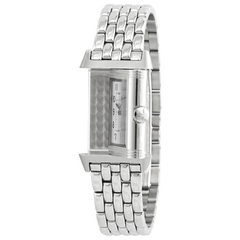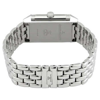 Stainless steel case with a stainless steel bracelet. Fixed stainless steel bezel. Silver dial with blue hands and Arabic numeral hour markers. Minute markers around an inner ring. Dial Type: Analog. Quartz movement. Scratch resistant sapphire crystal. Pull / push crown. Solid case back. Rectangle case shape. Case dimensions: 35.78 mm x 21 mm. Case thickness: 7.5 mm. Deployment clasp. Water resistant at 30 meters / 100 feet. Functions: hour, minute. Reverso Classic Series. Luxury watch style. Watch label: Swiss Made. Jaeger LeCoultre Reverso Classic Monoface Quartz Silver Dial Ladies Watch Q2618140.