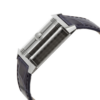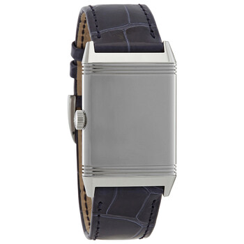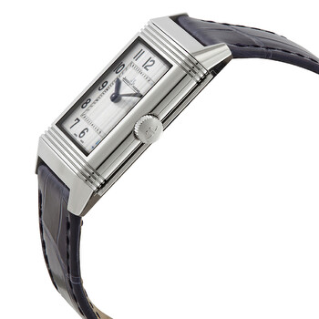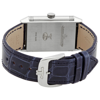 Silver-tone stainless steel case with a blue alligator leather strap. Fixed silver-tone stainless steel bezel. Silver dial with blue baton hands and Arabic numeral hour markers. Minute markers around an inner ring. Dial Type: Analog. Jaeger LeCoultre Calibre JLC 657 quartz movement. Scratch resistant sapphire crystal. Solid case back. Rectangle case shape, case size: 40.1 x 24.4 mm. Band width: 18 mm. Buckle clasp. Water resistant at 30 meters / 100 feet. Functions: hour, minute. Reverso Classic Series. Luxury watch style. Watch label: Swiss Made. Jaeger LeCoultre Reverso Classic Quartz Silver Dial Ladies Watch Q2518540.