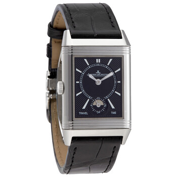 Silver-tone stainless steel case with a black alligator leather strap. Fixed silver-tone stainless steel bezel. Silver dial with blue sword-shaped hands and black Arabic numeral hour markers. Minute scale around the inner rim. Dial Type: Analog. One subdial displaying: small second. Jaeger LeCoultre Calibre JLC 854A/2 Hand Wind movement, containing 19 Jewels, composed of 160 parts, bitting at 21600 vph, and has a power reserve of approximately 42 hours. Scratch resistant sapphire crystal. Rectangle case shape, case size: 42.9 mm x 25.5 mm, case thickness: 9.2 mm. Deployment clasp. Water resistant at 30 meters / 100 feet. Functions: hour, minute, second, 24 hours, second time zone. Reverso Classic Series. Luxury watch style. Watch label: Swiss Made. Jaeger LeCoultre Reverso Classic Silver Dial Men's Hand Wound Watch Q2458420.