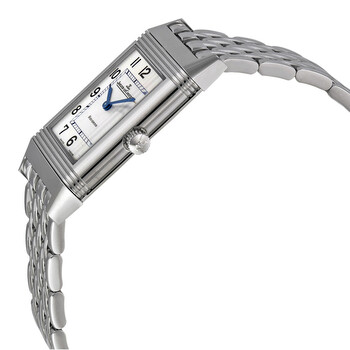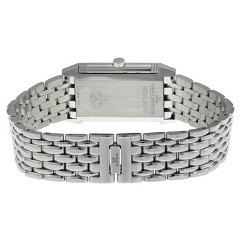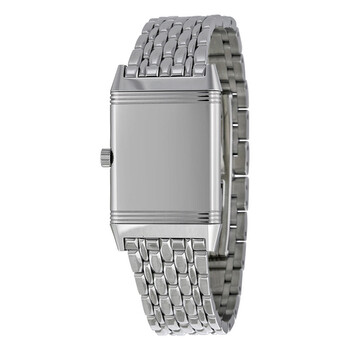 Silver-tone stainless steel case with a silver-tone stainless steel bracelet. Fixed silver-tone stainless steel bezel. White dial with blue sword-shaped hands and black Arabic numeral hour markers. Minute markers around the inner ring. Dial Type: Analog. Jaeger LeCoultre Calibre JLC 846/1 Hand Wind movement, containing 17 Jewels, composed of 93 parts, bitting at 21600 vph, and has a power reserve of approximately 40 hours. Scratch resistant sapphire crystal. Solid case back. Rectangle case shape, case size: 38.8 mm x 23.5 mm. Deployment clasp. Water resistant at 100 meters / 330 feet. Functions: hours, minutes. Reverso Classique Series. Dress watch style. Watch label: Swiss Made. Item Variations: Q2518110, 2518110, 251.81.10, Q251.81.10. Jaeger LeCoultre Reverso Classic White Dial Men's Watch Q2518110.