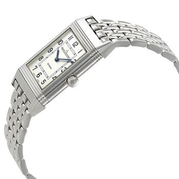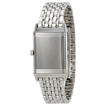 Silver-tone stainless steel case with a silver-tone stainless steel bracelet. Fixed silver-tone stainless steel bezel. Silver dial with blue sword-shaped hands and black Arabic numeral hour markers. Minute markers around an inner ring. Dial Type: Analog. Jaeger LeCoultre Calibre JLC 846/1 Hand Wind movement, containing 17 Jewels, composed of 93 parts, bitting at 21600 vph, and has a power reserve of approximately 40 hours. Scratch resistant sapphiree crystal. Solid case back. Rectangle case shape, case size: 38.8 mm x 23.5 mm. Band width: 18 mm. Deployment clasp. Water resistant at 30 meters / 100 feet. Functions: hour, minute. Reverso Classique Series. Luxury watch style. Watch label: Swiss Made. Item Variations: Q2508110, 2508110, 250.81.10, Q250.81.10. Jaeger LeCoultre Reverso Classique Silver Dial Stainless Steel Ladies Watch Q2508110.