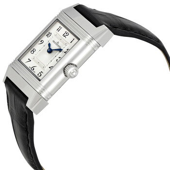 Silver-tone stainless steel case with a black leather strap. Fixed silver-tone bezel with diamond set. Black/silver dial with blue sword-shaped hands and black Arabic numeral hour markers. Minute markers around an inner ring. Dial Type: Analog. Jaeger LeCoultre Calibre JLC 844 Hand Wind movement, containing 18 Jewels, bitting at 21600 vph, and has a power reserve of approximately 38 hours. Scratch resistant sapphire crystal. Solid case back. Rectangle case shape, case size: 33.2 mm x 20.7 mm. Tang clasp. Water resistant at 30 meters / 100 feet. Functions: hour, minute. Reverso Duetto Series. Luxury watch style. Watch label: Swiss Made. Item Variations: Q2668412, 2668412, 266.84.12, Q266.84.12. Jaeger LeCoultre Reverso Duetto Diamond Bezel Ladies Watch Q2668412.