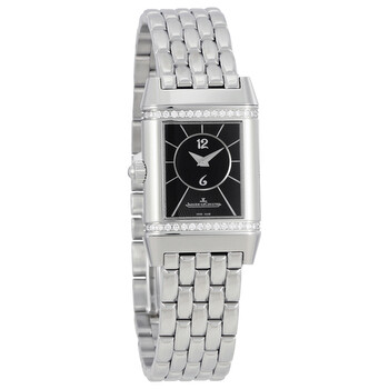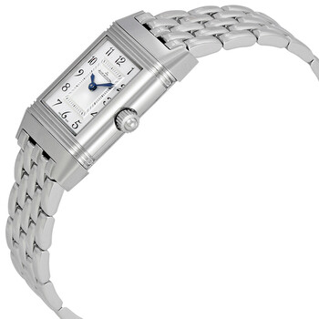 Silver-tone stainless steel case with a silver-tone stainless steel bracelet. Fixed silver-tone stainless steel bezel. Silver (front), black (back) dial with blue sword-shaped hands and black Arabic numeral hour markers. Minute markers around an inner ring. Dial Type: Analog. Jaeger LeCoultre Calibre JLC 844 Hand Wind movement, containing 18 Jewels, bitting at 21600 vph, and has a power reserve of approximately 38 hours. Scratch resistant sapphire crystal. Pull / push crown. Solid case back. Square case shape, case size: 33 mm x 20.7 mm, case thickness: 8.3 mm. Deployment with push button release clasp. Water resistant at 30 meters / 100 feet. Functions: hour, minute. Reverso Series. Dress watch style. Watch label: Swiss Made. Item Variations: Q2668112, 2668112, 266.81.12, Q266.81.12. Jaeger LeCoultre Reverso Duetto Silver and Black Dial Stainless Steel Ladies Watch Q2668112.