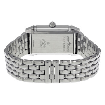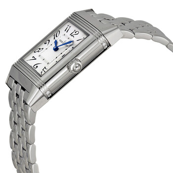 Silver-tone stainless steel case with a silver-tone stainless steel bracelet. Fixed silver-tone stainless steel bezel. Reversible silver and black dial with blue sword-shaped hands and black Arabic numeral hour markers. Minute markers around an inner ring. Dial Type: Analog. Jaeger LeCoultre Calibre JLC 865 Hand Wind movement, containing 19 Jewels, bitting at 21600 vph, and has a power reserve of approximately 48 hours. Scratch resistant sapphire crystal. Pull / push crown. Rectangle case shape, case size: 38.5 mm x 23.1 mm. Deployment clasp. Water resistant at 30 meters / 100 feet. Functions: hour, minute. Reverso Duetto Series. Luxury watch style. Watch label: Swiss Made. Item Variations: Q2568102, 2568102, 256.81.02, Q256.81.02. Jaeger LeCoultre Reverso Duetto Silver Dial Ladies Watch Q2568102.