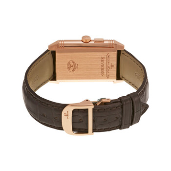 18kt rose gold case with a brown leather strap. Fixed 18kt rose gold bezel. Silver dial with blue sword-shaped hands and black Arabic numeral hour markers. Minute markers around an inner ring. Dial Type: Analog. One subdial displaying: small second at the 6 o'clock position. Jaeger LeCoultre Calibre JLC 854/1 Hand Wind movement, based upon JLC 844, containing 21 Jewels, composed of 180 parts, bitting at 21600 vph, and has a power reserve of approximately 45 hours. Scratch resistant sapphire crystal. Pull / push crown. Solid case back. Rectangle case shape, case size: 46 mm x 29 mm, case thickness: 7.3 mm. Band width: 22 mm. Deployment clasp. Water resistant at 30 meters / 100 feet. Functions: GMT, second time zone, hour, minute, small second, day/night indicator. Reverso Duo Series. Luxury watch style. Watch label: Swiss Made. Item Variations: Q2712410, 2712410, 271.24.10, Q271.24.10. Jaeger LeCoultre Reverso Duo Silver Dial 18kt Rose Gold Brown Leather Q2712410.