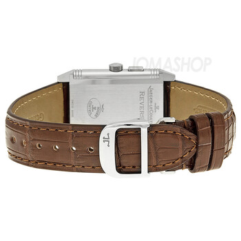 Silver-tone stainless steel case with a brown leather strap. Fixed silver-tone stainless steel bezel. Reversible grey and silver dial with blue sword-shaped hands and black Arabic numeral hour markers. Minute markers around an inner ring. Dial Type: Analog. One subdial displaying: small second at the 6 o'clock position. Jaeger LeCoultre Calibre JLC 854/1 Hand Wind movement, based upon JLC 844, containing 21 Jewels, composed of 180 parts, bitting at 21600 vph, and has a power reserve of approximately 45 hours. Scratch resistant sapphire crystal. Pull / push crown. Solid case back. Rectangle case shape, case size: 42 mm x 26 mm, case thickness: 9.5 mm. Band width: 22 mm. Deployment clasp. Water resistant at 30 meters / 100 feet. Functions: second, day, dual time, time zone, power reserve, hour. Additional Info: alternate model number q2718410. Reverso Series. Luxury watch style. Watch label: Swiss Made. Item Variations: Q2718410, 2718410, 271.84.10, Q271.84.10. Jaeger LeCoultre Reverso Duo Steel Men's Watch 271.84.10.