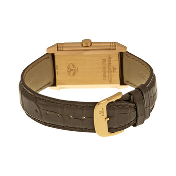 18kt pink gold case with a dark brown alligator leather strap. Fixed 18kt pink gold bezel. Silver guilloche dial with blue sword-shaped hands and black Arabic numeral hour markers. Minute markers aroundan inner ring. Dial Type: Analog. One subdial displaying: small second. Jaeger LeCoultre Calibre JLC 822 Hand Wind movement, containing 21 Jewels, composed of 134 parts, bitting at 21600 vph, and has a power reserve of approximately 45 hours. Scratch resistant sapphire crystal. Pull / push crown. Solid case back. Rectangle case shape, case size: 42.2 mm x 26 mm, case thickness: 9.5 mm. Band width: 18 mm. Tang clasp. Water resistant at 30 meters / 100 feet. Functions: hour, minute, second. Reverso Grande Taille Series. Luxury watch style. Watch label: Swiss Made. Item Variations: Q2702521, 2702521, 270.25.21, Q270.25.21. Jaeger LeCoultre Reverso Grande Taille Silver guilloche Dial Men's Watch Q2702521.