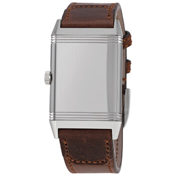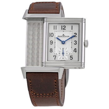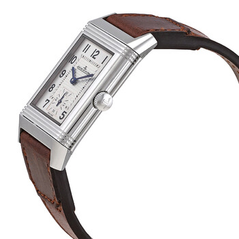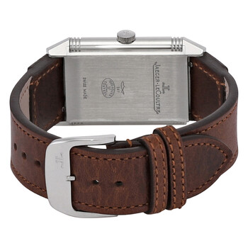 Silver-tone stainless steel case with a brown leather strap. Fixed silver-tone stainless steel bezel. Silver dial with blue sword-shaped hands and Arabic numeral hour markers. Minute scale around the inner rim. Dial Type: Analog. One subdial displaying: small second. Jaeger LeCoultre Calibre JLC 822/2 Hand Wind movement, based upon JLC 822, containing 21 Jewels, composed of 134 parts, bitting at 21600 vph, and has a power reserve of approximately 45 hours. Scratch resistant sapphire crystal. Screw down crown. Solid case back. Rectangle case shape, case size: 42.9 x 25.5 mm. Tang clasp. Water resistant at 30 meters / 100 feet. Functions: hour, minute, small second. Reverso Series. Sport watch style. Watch label: Swiss Made. Jaeger LeCoultre Reverso Hand Wind Silver Dial Watch Q2438522.