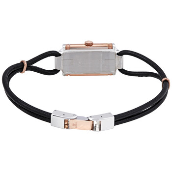 18kt rose gold and stainless steel case with a black leather strap. Fixed 18kt rose gold bezel. White dial with blue dauphine-style shape hands and Arabic numeral hour markers. Dial Type: Analog. Jaeger LeCoultre Calibre JLC 657 quartz movement. Scratch resistant sapphire crystal. Pull / push crown. Solid case back. Rectangle case shape, case size: 33.8 mm x 16.3 mm, case thickness: 7 mm. Water resistant at 30 meters / 100 feet. Functions: hour, minute. Reverso One Cordonnet Series. Luxury watch style. Watch label: Swiss Made. Jaeger LeCoultre Reverso One Cordonnet Ladies Steel and 18K Rose Gold Watch Q3264520.
