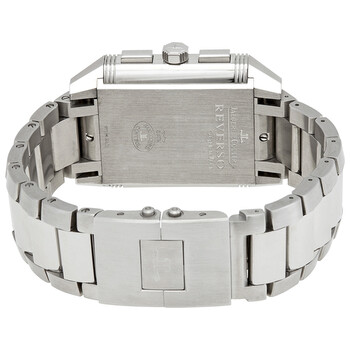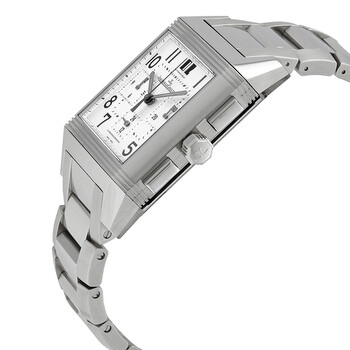 Silver-tone stainless steel case with a silver-tone stainless steel bracelet. Fixed silver-tone stainless steel bezel. Silver dial with luminous hands and Arabic hour markers. Minute markers around the outer rim. Dial Type: Analog. Date display at the 12 o'clock position. Chronograph - three sub-dials displaying: 24 hour, 12 hour and 30 minute. Jaeger LeCoultre Calibre JLC 754 Automatic movement, containing 39 Jewels, composed of 296 parts, bitting at 28800 vph, and has a power reserve of approximately 65 hours. Scratch resistant sapphire crystal. Rectangle case shape, case size: 41 mm x 35 mm, case thickness: 13 mm. Hidden fold over clasp. Water resistant at 50 meters / 165 feet. Functions: chronograph, date, hour, minute, second. Reverso Squadra Chronograph Gmt Series. Luxury watch style. Watch label: Swiss Made. Item Variations: Q7018120, 7018120, 701.81.20, Q701.81.20. Jaeger LeCoultre Reverso Squadra Silver Dial Chronograph Men's Watch Q7018120.