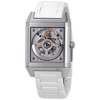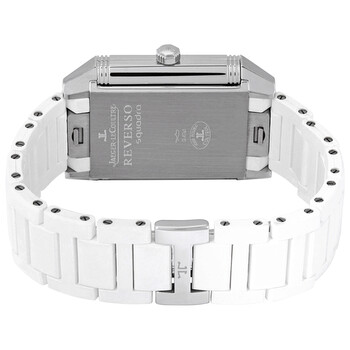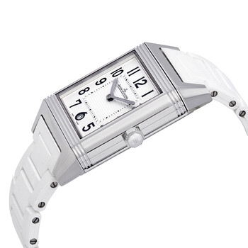 Silver-tone stainless steel case with a white rubber strap. Fixed silver-tone stainless steel bezel. White dial with silver-toned sword-shaped hands and black Arabic numeral hour markers. Minute markers around the outer rim. Dial Type: Analog. Date display at the 6 o'clock position. Jaeger LeCoultre Calibre JLC 966 Automatic movement, containing 28 Jewels, composed of 214 parts, bitting at 28800 vph, and has a power reserve of approximately 42 hours. Scratch resistant sapphire crystal. Pull / push crown. Solid case back. Rectangle case shape, case size: 42 mm x 28.8 mm. Deployment clasp. Water resistant at 50 meters / 165 feet. Functions: date, hour, minute. Reverso Squadra Series. Luxury watch style. Watch label: Swiss Made. Item Variations: Q7048720, 7048720, 704.87.20, Q704.87.20. Jaeger LeCoultre Reverso Squadra White Dial Stainless Steel White Rubber Ladies Watch Q7048720.
