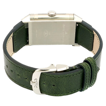 Silver-tone stainless steel case with a green leather strap. Fixed silver-tone stainless steel bezel. Green dial with silver-tone hands and index hour markers. Minute markers around the outer rim. Dial Type: Analog. One subdial displaying: small second. Jaeger LeCoultre Calibre JLC 822/2 Hand Wind movement, based upon JLC 822, containing 21 Jewels, composed of 134 parts, bitting at 21600 vph, and has a power reserve of approximately 45 hours. Scratch resistant sapphire crystal. Pull / push crown. Solid case back. Rectangle case shape, case size: 45.6 mm x 27.4 mm, case thickness: 8.5 mm. Deployment clasp. Water resistant at 30 meters / 100 feet. Functions: hour, minute, small second. Reverso Tribute Monoface Series. Luxury watch style. Watch label: Swiss Made. Jaeger LeCoultre Reverso Tribute Monoface Hand Wind Green Dial Men's Watch Q3978430.