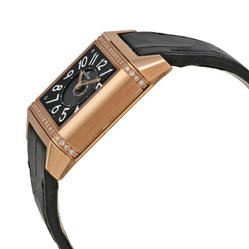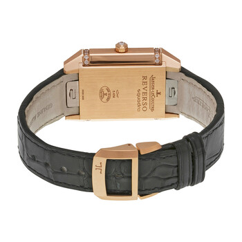 18kt rose gold case with a black leather strap. Fixed 18kt rose gold diamond set bezel. Silver dial with rose gold hands and Arabic numeral hour markers. Minute markers around an inner ring. Dial Type: Analog. Date display at the 6 o'clock position. Jaeger LeCoultre Calibre JLC 968 Automatic movement, containing 28 Jewels, composed of 207 parts, bitting at 28800 vph, and has a power reserve of approximately 38 hours. Scratch resistant sapphire crystal. Pull / push crown. Solid case back. Square case shape, case size: 42 mm x 28.8 mm, case thickness: 11.75 mm. Deployment clasp. Water resistant at 50 meters / 165 feet. Functions: date, hour, minute, second. Reverso squadra lady duetto series. Luxury watch style. Watch label: Swiss Made. Item Variations: Q7052420, 7052420, 705.24.20, Q705.24.20. Jaeger LeCoultre Squadra Duetto Silver Dial Diamond Ladies Watch Q7052420.