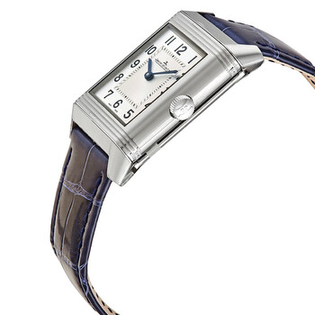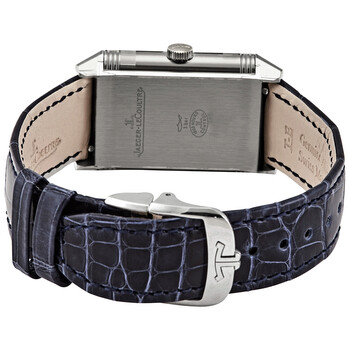 Silver-tone stainless steel case with a blue (alligator) leather strap. Fixed silver-tone stainless steel bezel. Reversible reverso (silver and black) dial with blue sword-style hands and black Arabic numeral hour markers. Minute markers around an inner ring. Dial Type: Analog. Jaeger LeCoultre Calibre JLC 854B/2 Hand Wind movement, containing 19 Jewels, composed of 124 parts, bitting at 21600 vph, and has a power reserve of approximately 45 hours. Scratch resistant sapphire crystal. Pull / push crown. Solid case back. Rectangle case shape, case size: 40 mm x 24 mm, case thickness: 9.6 mm. Double fold over clasp. Water resistant at 30 meters / 100 feet. Functions: hour, minute. Reverso Classic Medium Duetto Series. Luxury watch style. Watch label: Swiss Made. Jaeger-LeCoultre Reverso Classic Medium Duetto Hand Wind Ladies Watch Q2588422.