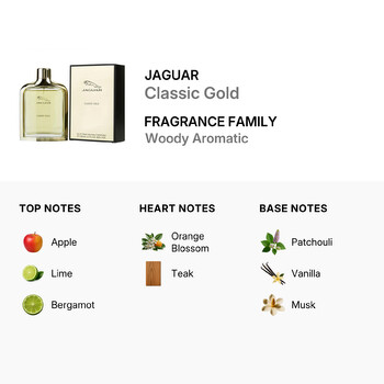 Jaguar Classic Gold opens with a vibrant blend of apple, lime, and bergamot. These crisp top notes create an energizing start that awakens the senses. As the fragrance settles, heart notes of warm orange blossom and rich teakwood bring depth and masculine elegance. The base features a lasting impression of earthy patchouli, smooth vanilla, and sensual musk—leaving a trail that's as unforgettable as it is refined.