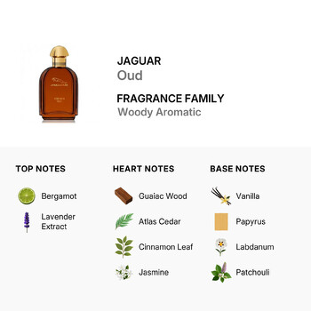 Belonging to the Woody Aromatic fragrance family, Jaguar Oud opens with a fresh burst of bergamot and soothing lavender extract. These energizing top notes quickly give way to a rich heart of guaiac wood, Atlas cedar, cinnamon leaf, and jasmine—blending warmth, spice, and subtle floral tones for a refined yet rugged appeal.