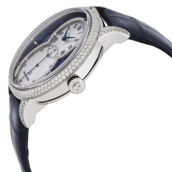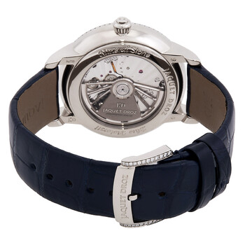 18kt white gold case with a blue alligator leather strap. Fixed bezel with diamond set. Mother of pearl dial with blue hands and Roman numeral hour markers. Dial Type: Analog. One subdial displaying: small second. Automatic movement. Scratch resistant sapphire crystal. Skeleton transparent exhibition see through case back. Round case shape, case size: 43 mm. Tang clasp. Water resistant at 30 meters / 100 feet. Functions: hour, minute, second. Grande Seconde Series. Luxury watch style. Item Variations: J014014288. Jaquet Droz Grande Seconde Automatic Diamond Men's Watch J014014288.