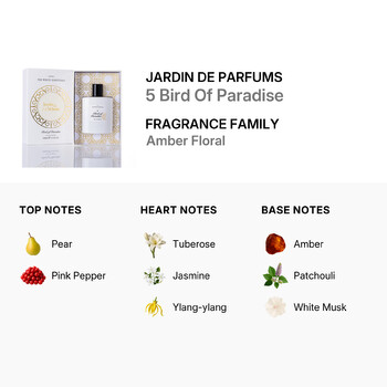 Belonging to the Amber Floral fragrance family, 5 Bird Of Paradise opens with a bright burst of juicy pear and a hint of pink pepper, creating a playful and refreshing top layer. As the scent evolves, the heart blooms with lush tuberose, jasmine, and exotic ylang-ylang—floral notes that radiate warmth and charm. The base settles into a rich and sensual blend of amber, patchouli, and soft white musk, leaving a lasting impression that’s both comforting and unforgettable.