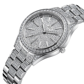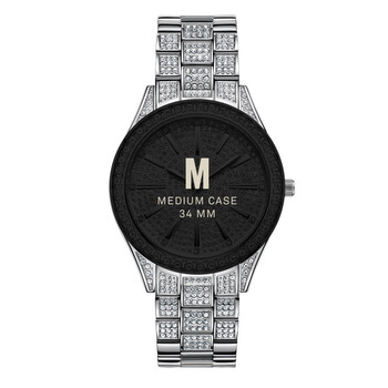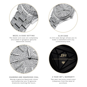 Stainless steel case with a stainless steel crystal pave bracelet. Fixed stainless steel crystal pave bezel. Silver (crystal pave) dial with silver-tone hands and diamond-tipped index hour markers. Dial Type: Analog. Quartz movement. Scratch resistant mineral crystal. Pull / push crown. Solid case back. Round case shape. Case size: 34 mm. Case thickness: 10 mm. Band width: 16 mm. Band length: 7.5 inches. Deployment clasp with a push button release. Water resistant at 50 meters / 165 feet. Functions: hour, minute, second. Additional Info: 12 diamonds. Cristal 34 Series. Luxury watch style. JBW Cristal 34 Quartz Diamond Silver Dial Ladies Watch J6383C.