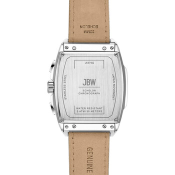 Echelon levels up a classic silhouette with 28 diamonds, a chronograph movement, and a dimensional dial. The tonneau-shaped case, fashioned in durable stainless steel, contours to the wrist and an adjustable, embossed leather band allows for the perfect fit. Silver-tone stainless steel case with a white crocodile leather strap. Fixed silver-tone stainless steel bezel. Silver-tone dial with silver-tone hands and index hour markers. Minute markers around the outer rim. Dial Type: Analog. Luminescent hands and markers. Date display between 4 and 5 o'clock position. Chronograph - three sub-dials displaying: 60 second, 30 minute and 24 hour. Miyota Caliber JS25 quartz movement. Scratch resistant mineral crystal. Pull / push crown. Solid case back. Tonneau case shape, case size: 41 mm, case thickness: 12 mm. Band width: 22 mm, band length: 8 inches. Buckle clasp. Water resistant at 50 meters / 165 feet. Functions: chronograph, date, hour, minute, second. Echelon Series. Luxury watch style. Watch label: Japan Movt. JBW Echelon Chronograph Quartz Silver Dial Unisex Watch J6379G.