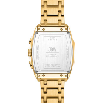 Yellow gold-tone stainless steel case and bracelet. Fixed yellow gold-tone stainless steel bezel. Gold-tone dial with yellow gold-tone hands and index hour markers. Minute markers around the outer rim. Dial Type: Analog. Luminescent hands and markers. Date display between 4 and 5 o'clock position. Chronograph - three sub-dials displaying: 60 second, 30 minute and 24 hour. Miyota Caliber JS25 quartz movement. Scratch resistant mineral crystal. Pull / push crown. Solid case back. Tonneau case shape, case size: 41 mm, case thickness: 12 mm. Band width: 22 mm, band length: 8 inches. Deployment with push button release clasp. Water resistant at 50 meters / 165 feet. Functions: chronograph, date, hour, minute, second. Additional Info: the echelon artfully balances bold angles with brilliant detail. ten genuine diamonds illuminate a dimensional dial, creating a sophisticated interpla. Echelon Collection Series. Casual watch style. Watch label: Japan Movt. JBW Echelon Collection Chronograph Quartz Gold Dial Men's Watch J6409A.