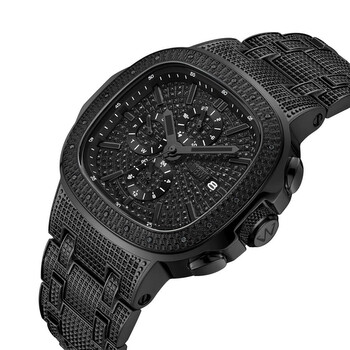 A nostalgic shape with modern finishes. The Heist features a rounded square case, embellished dial, 20 black diamonds, and a multifunctional movement. A textured bracelet crafted in durable IP black-plated stainless steel, adjustable for a custom fit, completes the distinctive look. Black stainless steel case and bracelet. Fixed black stainless steel bezel. Black dial with black hands and index hour markers. Minute markers around the outer rim. Dial Type: Analog. Luminescent hands and markers. Date display at the 3 o'clock position. Three sub-dials displaying: date, 24 hour and 24 hour. Miyota Caliber JP15 quartz movement. Scratch resistant mineral crystal. Pull / push crown. Solid case back. Square case shape, case size: 47.5 mm, case thickness: 12 mm. Band width: 26 mm, band length: 8 inches. Deployment with push button release clasp. Water resistant at 50 meters / 165 feet. Functions: date, day, GMT, second time zone, hour, minute, second. Heist Series. Luxury watch style. Watch label: Japan Movt. JBW Heist GMT Quartz Black Dial Unisex Watch J6380E.