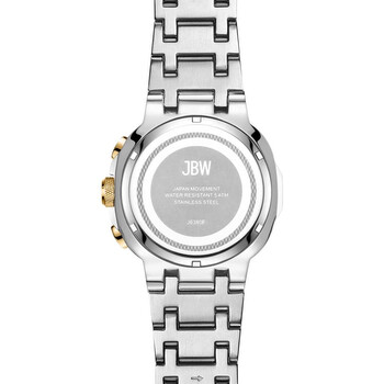 A nostalgic shape with modern finishes. The Heist features a rounded square case, embellished dial, 20 diamonds, and a multifunctional movement. A textured, two-tone bracelet crafted in durable, 18K gold-plated stainless steel, adjustable for a custom fit, completes the distinctive look. Silver-tone stainless steel case with a two-tone stainless steel bracelet. Fixed yellow gold-tone stainless steel bezel. Green dial with yellow gold-tone hands and index hour markers. Minute markers around the outer rim. Dial Type: Analog. Luminescent hands and markers. Date display at the 3 o'clock position. Three sub-dials displaying: date, 24 hour and 24 hour. Miyota Caliber JP15 quartz movement. Scratch resistant mineral crystal. Pull / push crown. Solid case back. Square case shape, case size: 47.5 mm, case thickness: 12 mm. Band width: 26 mm, band length: 8 inches. Deployment with push button release clasp. Water resistant at 50 meters / 165 feet. Functions: date, day, GMT, second time zone, hour, minute, second. Heist Series. Luxury watch style. Watch label: Japan Movt. JBW Heist GMT Quartz Green Dial Unisex Watch J6380F.