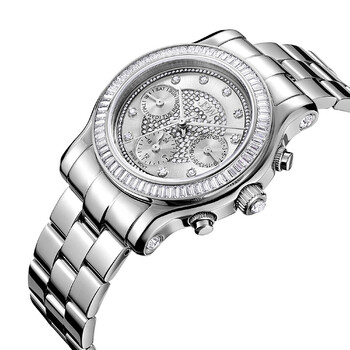 Stainless steel case with a stainless steel bracelet. Fixed baguette crystal bezel. Silver dial with silver-tone hands and diamond hour markers. Dial Type: Analog. Day of the week and date display at the 3 o'clock position. Three - day, date and 24 hour. Quartz movement. Scratch resistant mineral crystal. Pull / push crown. Solid case back. Case size: 38 mm. Case thickness: 11 mm. Round case shape. Band width: 18 mm. Band length: 7.5 inches. Deployment with push button clasp. Water resistant at 50 meters / 165 feet. Functions: date, day, GMT, second time zone, hour, minute, second. Casual watch style. JBW Laurel Silver Multi-Function Diamond Dial Steel Bracelet Ladies Watch J6330B.