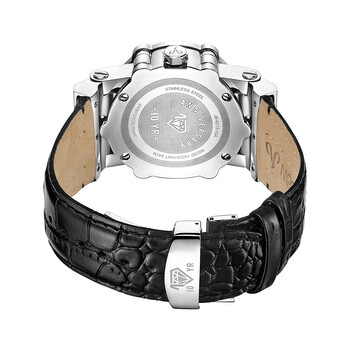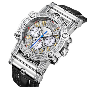 Stainless steel case with a black leather strap. Fixed stainless steel bezel set with diamond pave. Diamond-set lugs. Silver (diamond pave) dial with luminous silver-tone arrow-shaped hands and Arabic numeral hour markers. Arabic numeral minute markers (at 5 minute intervals). Minute markers around the outer rim. Dial Type: Analog. Luminescent hands. Date display between the 4 and 5 o'clock positions. Chronograph - three sub-dials displaying: 60 second, 60 minute and 24 hour. Hattori caliber VD53 quartz movement. Scratch resistant mineral crystal. Solid case back. Round case shape. Case size: 42 mm. Case thickness: 14 mm. Band width: 30 mm. Band length: 8.5 inches. Butterfly clasp. Water resistant at 50 meters / 165 feet. Functions: chronograph, date, GMT, second time zone, hour, minute, second. Additional Info: 196 diamonds - 1.96 ctw. Phantom 10 Year Series. Dress watch style. Watch label: Japan Movt. JBW Men's 10 YR Anniversary Phantom 1.96 ctw Diamond Chronograph Watch JB-6215-10A.