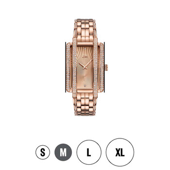 18kt rose gold-plated stainless steel case with a 18kt rose gold-plated stainless steel bracelet set with crystals. Fixed 18kt rose gold-plated bezel set with crystals. Rose dial with rose gold-tone dauphine-style hands. Diamonds mark the 6 and 12 o'clock positions. Dial Type: Analog. Sconds subdials. Quartz movement. Scratch resistant mineral crystal. Pull / push crown. Solid case back. Rectangle case shape. Case size: 28 mm. Case thickness: 10 mm. Band width: 18 mm. Band length: 7.5 inches. Deployment clasp. Water resistant at 50 meters / 165 feet. Functions: hour, minute, small second. Mink Series. Dress watch style. Watch label: Swiss Movt. JBW Mink Rose Dial 18kt Rose Gold-plated Ladies Watch J6358C.