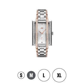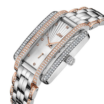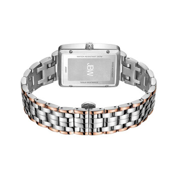 Stainless steel case with a two-tone (silver-tone and rose gold-tone) stainless steel bracelet set with crystals. Fixed stainless steel bezel set with crystall. Silver dial with rose gold-tone hands. Crystals set at the 6 and 12 o'clock positions. Dial Type: Analog. Small seconds sub-dial. Quartz movement. Scratch resistant mineral crystal. Pull / push crown. Solid case back. Rectangle case shape. Case size: 28 mm. Case thickness: 10 mm. Band width: 18 mm. Band length: 7.5 inches. Deployment clasp. Water resistant at 50 meters / 165 feet. Functions: hour, minute, second. Mink Series. Dress watch style. JBW Mink Silver Dial Two-tone Ladies Watch J6358D.