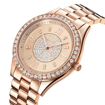 18kt rose gold-plated stainless steel case and bracelet. Fixed 18kt rose gold-plated bezel set with Swarovski crystals. Rose dial with rose gold-tone hands and diamond-set index hour markers. Roman numerals appear atthe 3, 6, 9 and 12 o'clock position. Arabic numeral minute markers (at 5 minute intervals). Minute markers around the outer rim. Dial Type: Analog. Quartz movement. Scratch resistant mineral crystal. Pull / push crown. Solid case back. Round case shape. Case size: 37 mm. Case thickness: 10 mm. Band width: 18 mm, band length: 7.5 inches. Deployment with push button release clasp. Water resistant at 50 meters / 165 feet. Functions: hour, minute, second. Mondrian Series. Dress watch style. JBW Mondrian Quartz Diamond Crystal Rose Dial Ladies Watch J6303C.