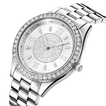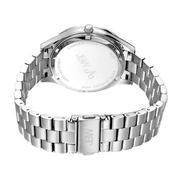 Stainless steel case with a stainless steel bracelet. Fixed stainless steel set with Swarovski crystals bezel. Silver (Swarovski crystal-set) dial with silver-tone hands and diamond hour markers. Roman numerals mark the 3, 6, 9 and 12 o'clock positions. Minute markers around the outer rim. Dial Type: Analog. Quartz movement. Scratch resistant mineral crystal. Pull / push crown. Solid case back. Round case shape. Case size: 37 mm. Case thickness: 10 mm. Band width: 18 mm. Band length: 7.5 inches. Fold over clasp with a push button release. Water resistant at 50 meters / 165 feet. Functions: hour, minute, second. Mondrian Series. Dress watch style. Watch label: Japan Movt. JBW Mondrian Silver Diamond Dial Stainless Steel Ladies Watch J6303A.