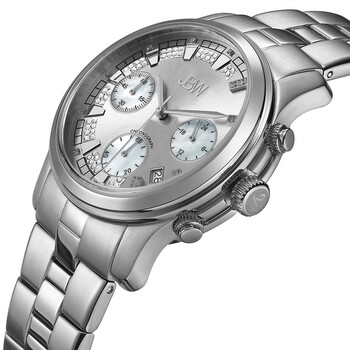 Silver-tone stainless steel case and bracelet. Fixed silver-tone stainless steel bezel. Silver dial with silver-tone sword-shaped hands and 21 diamonds / index hour markers. Minute markers around the outer rim. Dial Type: Analog. Date display between 4 and 5 o'clock position. Chronograph - three sub-dials displaying: 60 second, 60 minute and 24 hour. Hattori Caliber VD53 quartz movement. Scratch resistant mineral crystal. Pull / push crown. Solid case back. Round case shape, case size: 38 mm, case thickness: 13 mm. Band width: 20 mm, band length: 7.5 inches. Deployment with push button release clasp. Water resistant at 50 meters / 165 feet. Functions: chronograph, date, GMT, second time zone, hour, minute, second. Muse Series. Dress watch style. Watch label: Japan Movt. Item Variations: JB 6217 K, JB.6217.K, JB6217K. JBW Muse Chronograph Quartz Diamond Silver Dial Unisex Watch JB-6217-K.