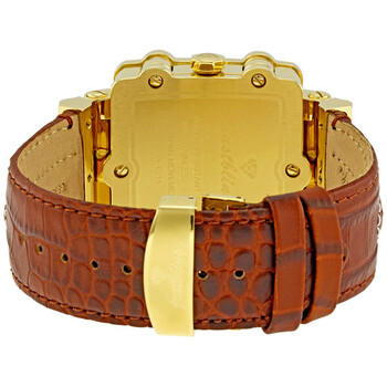 Yellow gold-tone stainless steel case with a brown leather strap. Fixed yellow gold-tone bezel set with diamonds. Gold crystal-set dial with luminous yellow gold-tone hands and Arabic numeral hour markers. Minute markers around the outer rim. Dial Type: Analog. Luminescent hands. Date display between the 4 and 5 o'clock positions. Chronograph - three black sub-dials displaying: 60 second, 60 minute and 24 hour. Hattori caliber VD53 quartz movement. Scratch resistant sapphire crystal. Pull / push crown. Solid case back. Square case shape. Case size: 46 mm. Case thickness: 14 mm. Band width: 30 mm. Band length: 8.5 inches. Deployment clasp. Water resistant at 50 meters / 165 feet. Functions: chronograph, date, hour, minute, second. Additional Info: total diamonds: 238. Phantom Series. Dress watch style. Item Variations: 6215 238 A, 6215.238.A, 6215238A. JBW Phantom Chronograph Quartz Diamond Men's Watch JB-6215-238-A.