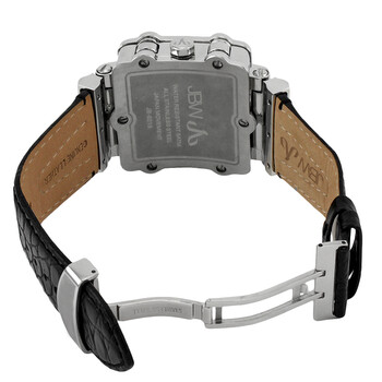 Stainless steel case with a black leather strap. Fixed stainless steel bezel set with diamonds. Silver crystal-set dial with luminous silver-tone hands and Arabic numeral hour markers. Minute markers around the outer rim. Dial Type: Analog. Luminescent hands and markers. Date display between the 4 and 5 o'clock positions. Chronograph - three sub-dials displaying: 60 second, 60 minute and 24 hour. Hattori caliber VD53 quartz movement. Scratch resistant sapphire crystal. Pull / push crown. Solid case back. Square case shape. Case size: 46 mm. Case thickness: 14 mm. Band width: 30 mm. Band length: 8.5 inches. Fold over clasp. Water resistant at 50 meters / 165 feet. Functions: chronograph, date, hour, minute, second. Additional Info: total diamonds: 238. Phantom Series. Dress watch style. Item Variations: 6215 238 B, 6215.238.B, 6215238B. JBW Phantom Silver-tone Chronograph Crystal Dial Silver-tone Steel Diamond Men's Watch JB-6215-238-B.