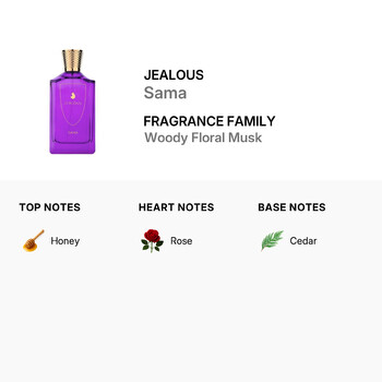 Sama belongs to the Woody Floral Musk fragrance family, creating a rich and layered scent experience. The top note of sweet honey welcomes you with warmth and comfort, while the heart reveals a blooming rose that adds a soft and romantic touch. As the scent settles, the base note of cedar provides a deep, woodsy finish that lingers gently on the skin.