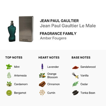 Jean Paul Gaultier Le Male opens with a refreshing burst of mint, artemesia, cardamom, and bergamot—delivering a crisp and invigorating start. As the scent unfolds, warm heart notes of lavender, orange blossom, cinnamon, and cumin bring a comforting yet spicy twist. The base notes of sandalwood, vanilla, cedar, tonka bean, and amber create a smooth, long-lasting finish that is both masculine and refined.