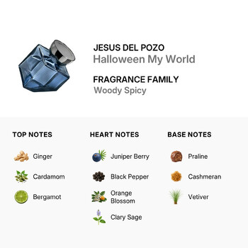 Halloween My World belongs to the Woody Spicy fragrance family, delivering a rich, masculine aroma that’s both fresh and intense. It opens with a vibrant mix of ginger, cardamom, and bergamot—creating an energetic burst that instantly grabs attention. As the scent evolves, heart notes of juniper berry, black pepper, orange blossom, and clary sage bring a warm and aromatic depth that’s both intriguing and refined.