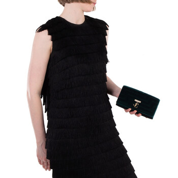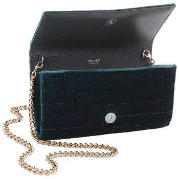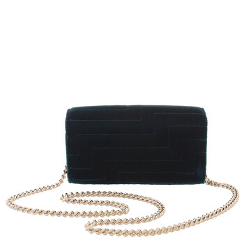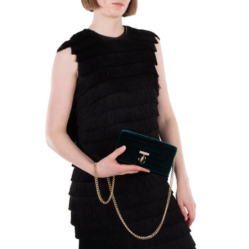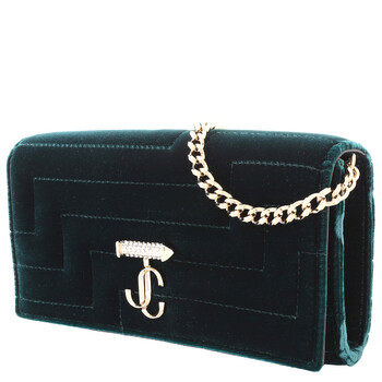 Jimmy Choo Ladies Wallets. SKU: J000164059-DARK GREEN/LIGHT GOLD. Color: Green. Size: W: 8.2" x H: 6" x D: 1.5". Jimmy Choo Avenue JC Emblem Continental Chain Wallet. The Avenue wallet features a luxurious velvet finish, a crystal-embellished JC emblem, a chain-link shoulder strap, a foldover top with magnetic fastening, a spacious main compartment, an internal logo stamp, and an internal zip-fastening pocket. Outer: Velvet 72%, Calf Leather 15%, Brass 10%, Crystal 3%. Made in Italy.