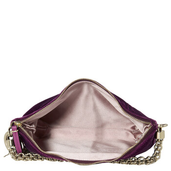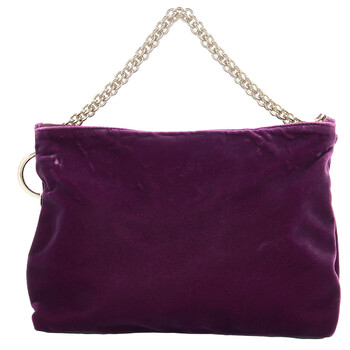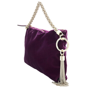 Jimmy Choo Ladies Clutch. SKU: J000163912001. Color: Boysenberry. Size: L24 x H20 x W3.5cm. Jimmy Choo Callie Shimmer Suede Clutch Bag. The Callie clutch bag is crafted from shimmering suede and features a multifunctional chain strap. It has one main internal compartment and offers two styling options: loop the chain through the hoop for a handheld evening pouch or drape it over your arm for a chic crossbody look. Made in Italy.