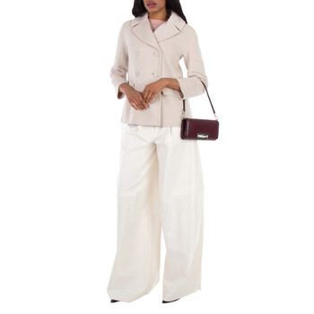 Jimmy Choo Ladies Shoulder Bag. SKU: J000170137-GARNET/ANTIQUE SILVER. Color: Garnet/Antique Silver. Jimmy Choo Garnet Leather Mini Shoulder Bag. This Jimmy Choo bag features a sleek, structured silhouette in a rich burgundy hue, crafted from smooth leather. Accentuated with a silver-tone geometric clasp engraved with the brand's logo, it exudes timeless elegance. The bag includes a slender shoulder strap for versatile wear, making it a chic accessory for any occasion. 100% Leather. Made in Italy.