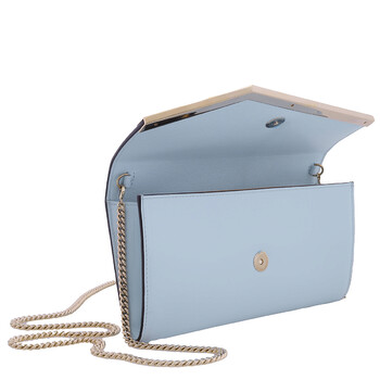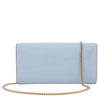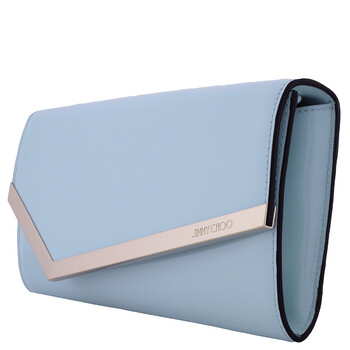 Jimmy Choo Ladies Clutch. SKU: J000163920-ICE BLUE/LIGHT GOLD. Color: Blue. Jimmy Choo Logo Engraved Emmie Clutch. This clutch is made from leather with a patent finish and features a metal frame, logo-engraved metal feet, an asymmetric front flap and a press-stud fastening. Material: leather. Made in Italy.