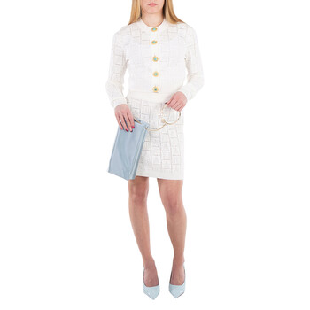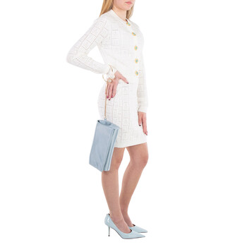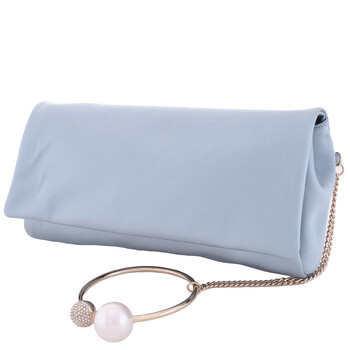 Jimmy Choo Ladies Clutch. SKU: J000164123-ICE BLUE/LIGHT GOLD. Color: Blue. Size: 10.6"W x 2"D x 5.5"H. Jimmy Choo Xandra Bangle Handle Clutch. This clutch features a bracelet chain handle with pave and imitation pearl details, a magnetic flap closure, an interior slip pocket, and polished gold-tone hardware. Material: Fabric/brass/plastic/crystal. Made in Italy.